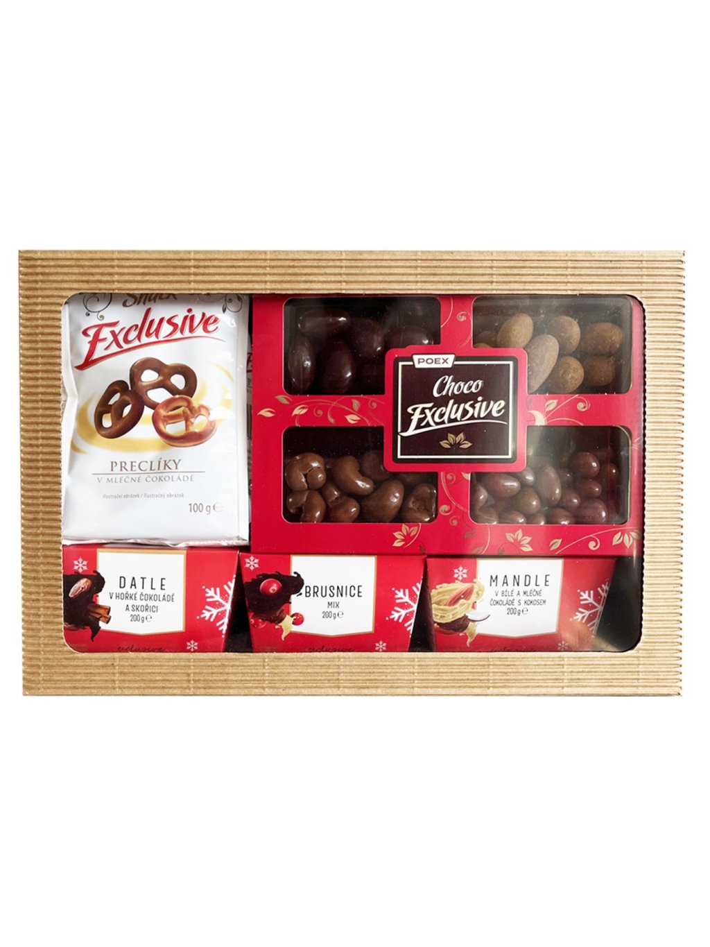 Směs proslazených plodů klikvy velkoplodé (34 %) v hořké čokoládě (22 %), mléčné čokoládě (22 %) a bílé čokoládě (22 %)